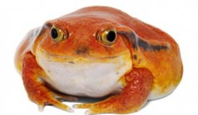 Well known for its bright red color, the Tomato Frog is one of the most colorful species of frogs there are. The back of the frog is usually orangish-red to bright red with yellowish undersides and sometimes black spots on their throats. While males are usually a little orange to brown in color, younger ones are usually a little pale; acquiring their bright colors only once they mature. It is common to buy babies that are more of a brown color and grow them into colorful adults.
