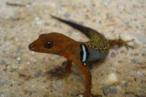 The colorful Gold Dust Day Gecko of Madagascar and Comoros is a lizard that feeds on insects and nectar. This tiny lizard, growing up to 9 inches long, is bright green or yellowish green or rarely even blue in color. Its neck and upper back are characterized by yellow speckles. Its upper eyelids, feet and toes are blue.
