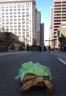 Wasabi, in a dress, strutting her stuff in a St. Patrick's Day Parade.